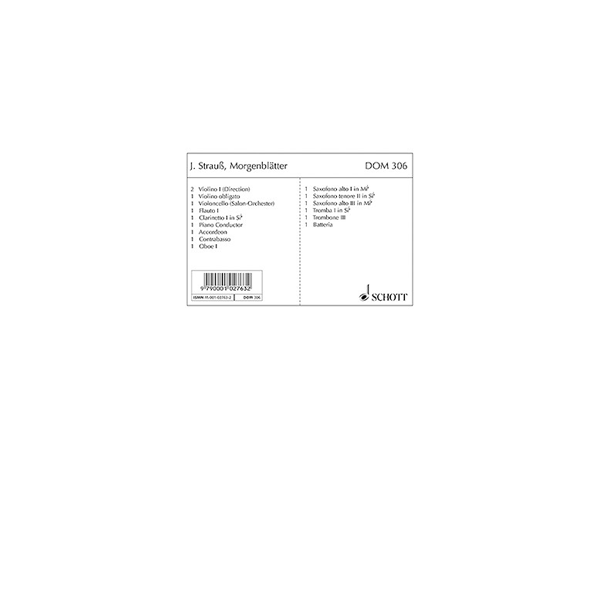 Instrumentation: Piano (Direktion), Akkordeon (bzw. Harmonium), 2 Violinen I (Direktion), Violine obligat, Violoncello, Kontrabass, Flöte, Oboe, Klarinette, evt. Saxophon I, II, III, Trompete, Posaune III, evt. Gitarre, Pauken und Schlagzeug