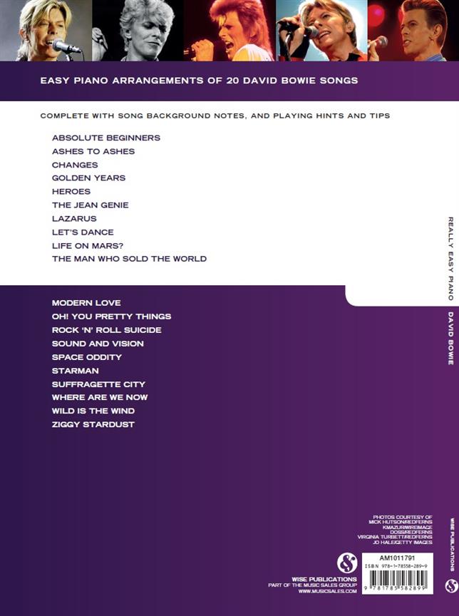 Really Easy Piano David Bowie includes 20 timeless songs that span the ever-evolving career of the incredible musical legend. All songs are arranged for Easy Piano and feature song background notes, as well as playing hints and tips, making this the perfect songbook for beginners looking to learn these wonderful songs.